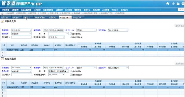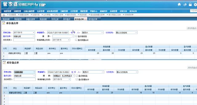 上图中,因为货位的不同,每个货位显示了一行,账面数量都为20,盘点数量,分别为16、23,第一行账面数量20>盘点数量16,故生成报损单,报损数量4,;第二行账面数量20<盘点数量23,故生成报溢单,报溢数量3。