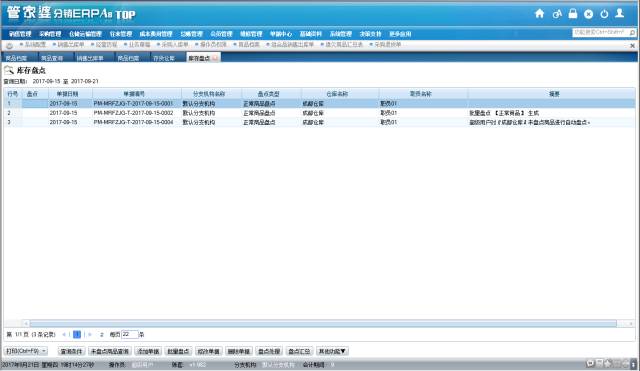在“仓储运输管理-盘点管理-库存盘点”进入库存盘点列表界面显示的是以上三种方法添加的盘点单,若是批量生成或未盘点单据查询生成的单据,在摘要字段有说明,如图: