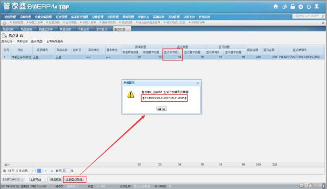 盘点汇总:在库存盘点列表界面,点击表尾的“盘点汇总”按钮对未盘点状态的单据进行盘点。
