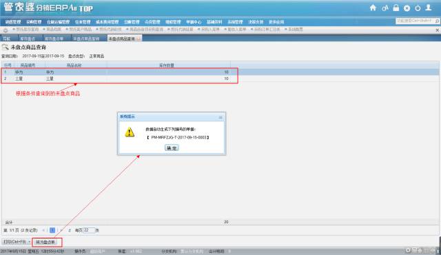 → 点击图中左下角的“转为盘点单”按钮,弹出提示框“请确定是否将该仓库未盘点商品转为盘点单”,点击“取消”按钮,留在未盘点商品查询结果界面,点击“确定”按钮,提示转为盘点单成功并显示盘点单单据编号。